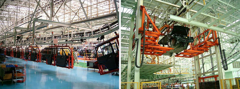 長豐汽車公司永州基地新總裝車間輸送系統(tǒng)是為了適應(yīng)不斷擴大的產(chǎn)量而新建的,批量年產(chǎn)5萬輛,分底盤線、內(nèi)飾線、車門線以及上下轉(zhuǎn)掛用的升降機及隨動裝置,車身底盤裝配輸送機系統(tǒng)是YTJ6型號的輸送機組成,共由一條快鏈和一條慢鏈組成,工藝速度1-2.5m/min,鏈條長度約780米,小車積放長度5300mm,工位間距6128mm,小車組采用6車組型式,小車數(shù)27套。內(nèi)飾線采用YTJ6型號的輸送機,共由一條快鏈和一條慢鏈組成,工藝速度1-2.5m/min,鏈條長度約500米,小車積放長度5300mm,工位間距6128mm,小車組采用6車組型式,小車數(shù)24套。車門線采用YTJ4型號的輸送機,共由兩條快鏈和一條慢鏈組成,工藝速度1-2.5m/min,鏈條長度約1200米,小車積放長度3500mm,工位間距4300mm,小車組采用3車組型式,小車數(shù)85套。