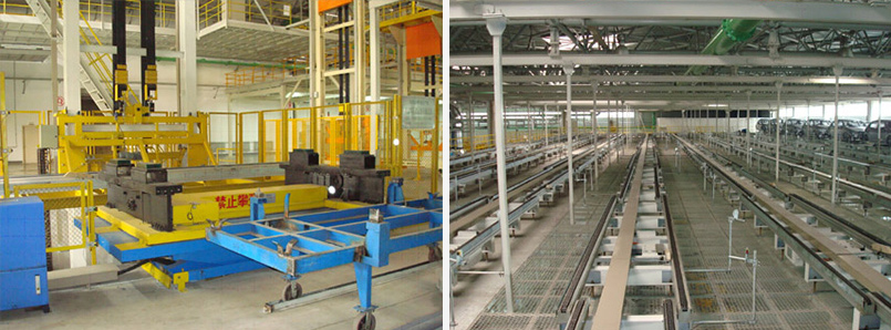 白車身從原來的升降段提升到系統上線處,接車后輸送到焊裝空中存儲線,在由存儲線輸送到涂裝車間,白車身在上線升降段提到到位,M1、M2車在地面通過從焊裝到涂裝的儲存線的升降段進入焊裝至涂裝儲存線的全部工位,包括鏈式滾床、升降段等。在車身經升降段進入空中儲存線的結構平臺后,設置打號機操作區,滾床儲存線和打號機具有通信和連鎖功能。該設備的生產節拍為110s/臺,A1車焊裝空中儲存區設計的白車身儲存量為100臺。白車身從焊裝車間進入涂裝車間的方式為過廊,在過廊設置三條滾床輸送線,過廊兩端設置帶式升降機。A1車身焊裝儲存線設車身自動分類編組功能,焊裝至涂裝的三條輸送線,分別對應A1、M1、M2車身的自動分組輸送功能。A1車身焊裝儲存線和焊裝至涂裝儲存線中包含橫移機和旋轉臺,并在附近設一操作臺,便于手動和自動的切換。電氣控制系統采用PLC、總線控制方式,控制系統配置人機界面的觸摸屏,實現人機交流。