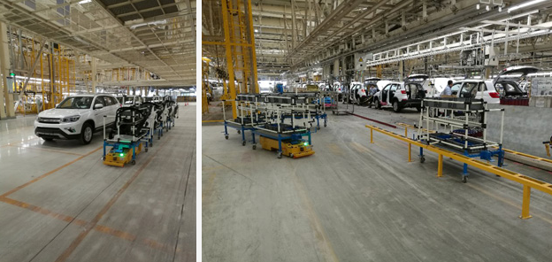 北京長安汽車公司屬于重慶長安汽車股份有限公司,主要生產(chǎn)中高端SUV車型,該AGV項(xiàng)目用于總裝車間底盤線、終裝線物流配送。配送方式采用SPS供給模式,將物料按正確的數(shù)量在準(zhǔn)確的時(shí)刻運(yùn)送到正確的地點(diǎn),實(shí)現(xiàn)無人化配送,滿足生產(chǎn)線60JPH節(jié)拍。AGV采用磁道航導(dǎo)引系統(tǒng),并通過控制系統(tǒng)與其他管理系統(tǒng)即時(shí)通訊,可實(shí)現(xiàn)無人自動(dòng)化運(yùn)輸,是汽車行業(yè)等提升行業(yè)競爭力、減少人工成本、提高倉配效率的選擇。